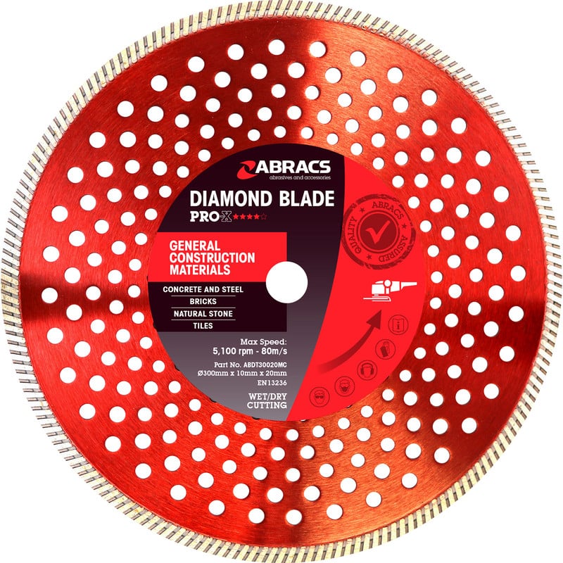 Pro-line General Construction Materials Diamond Blades are designed for maximum performance and long life. The 10mm angled turbo segments and narrow gullets reduce the chance of segment loss & make this blade one of the fastest cutting general purpose blades on the market. Manufactured using premium quality diamonds and a strengthened, pre-stressed metal body.
